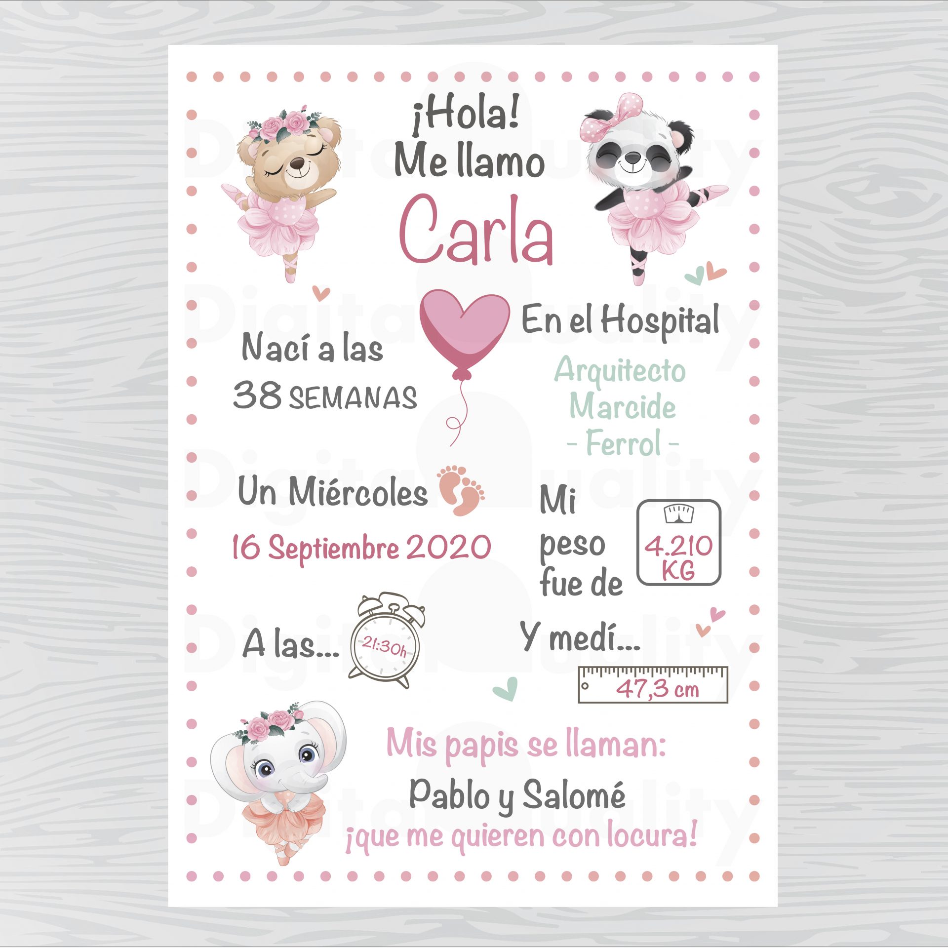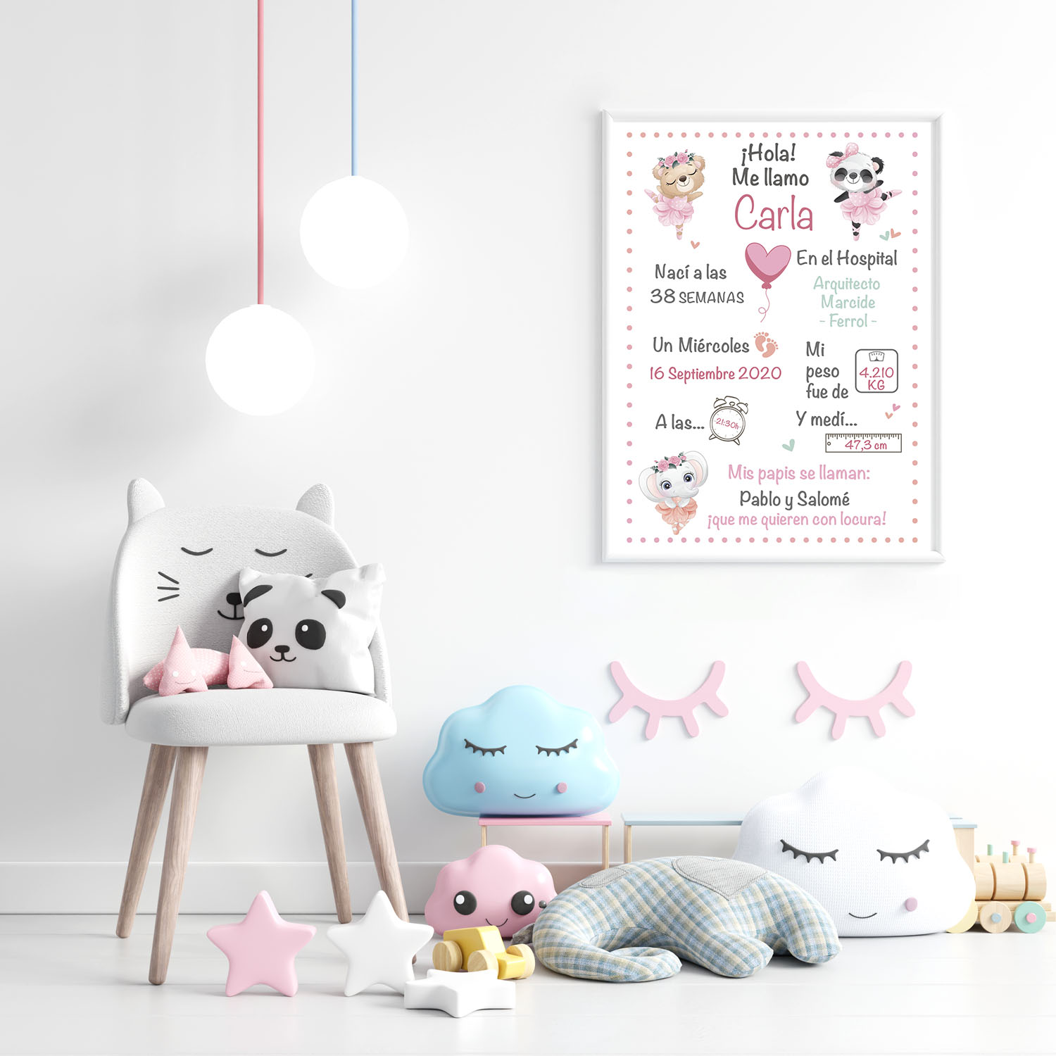 Lámina infantil de nacimiento personalizable de ballet. Tamaño A3.