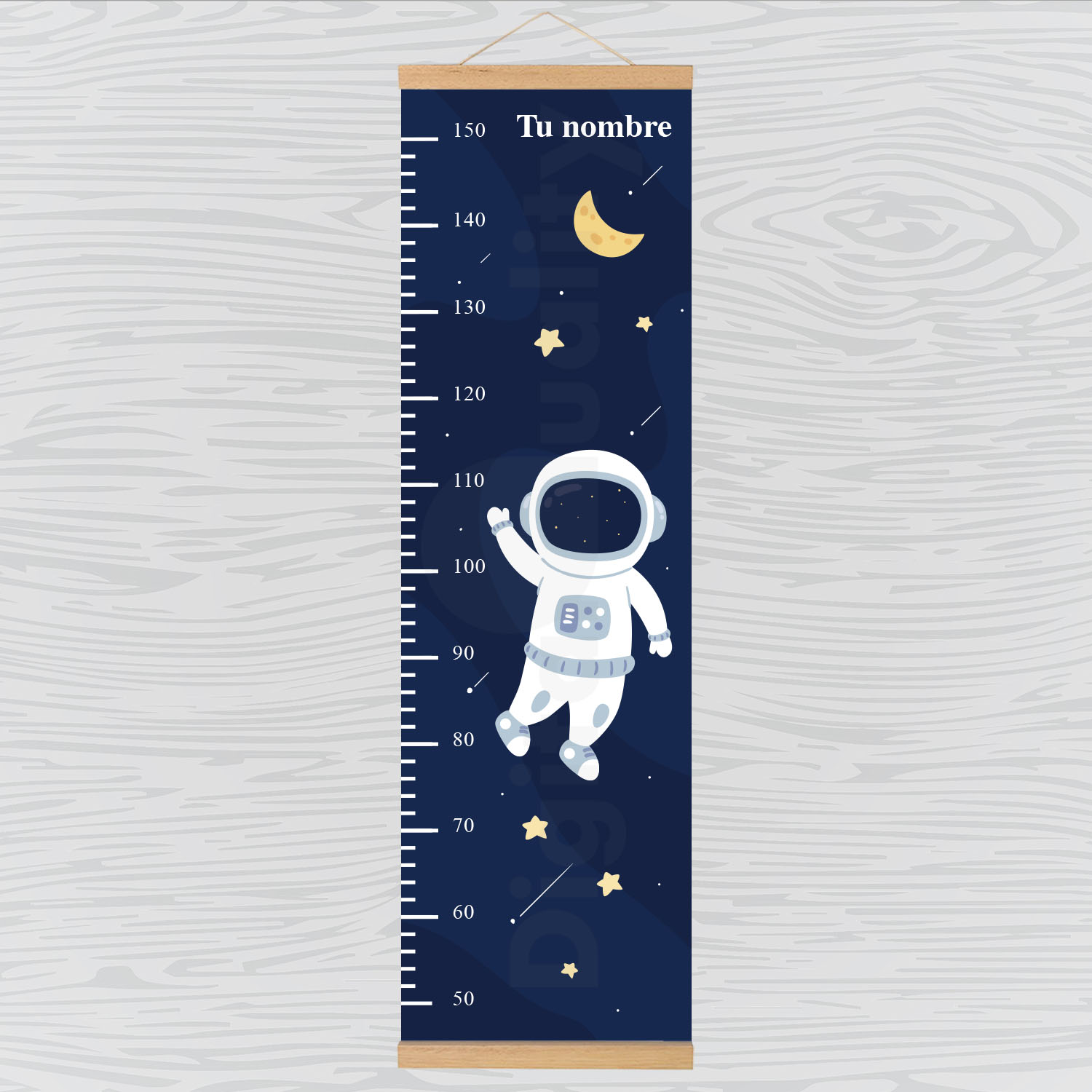 ¡Los peques crecen muy deprisa! Este colgador te permitirá medir hasta 1,50 m y podrás comprobar día a día como crecen. Al contrario que los medidores de vinilo, este medidor no estropea la pared, adaptado con un colgador de madera se puede colgar en la pared, el armario, puerta, etc. Impreso en lona de alta resistencia que podrás limpiar muy fácilmente con una esponja suave o un trapo.